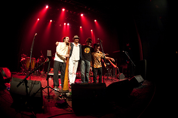 A first album - Kinda Roots - was released at the end of 2009, demonstrating the endless possibilities of didgeridoo music following different musical universes. With this first proposal in hands, the band ended up getting to coveted Entrées en scène Loto-Québec 2010-2011 bursary program. Their remarked venue at the RIDEAU showcase in 2010 allowed them to get a tour of over 40 shows all around the province of Quebec. They were also noticed at the Toronto Global Groove festival and they did a mini tour of B-C, which brought them to the Salmon Arm Roots & Blues Festival and a few other outside venues. After offering over a hundred shows between 2009 and 2011, including festivals, small inside venues, corporate events and mainstream cultural theaters, the band had to beef up its repertoire, by improving melodic lines to be better suited to sitting audiences.